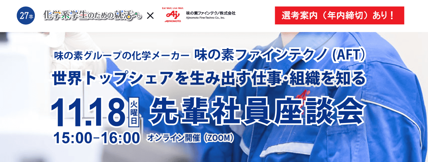 化学系学生のための就活 マイページより参加予約をお願いします。 予約完了後、会社説明動画をご案内いたしますのでイベント当日までにご視聴ください。参加用ZoomURLは開催日前日までにメールおよびマイページメッセージにてご連絡いたします。 ※終了後アンケートへの回答にご協力をお願いいたします。 |