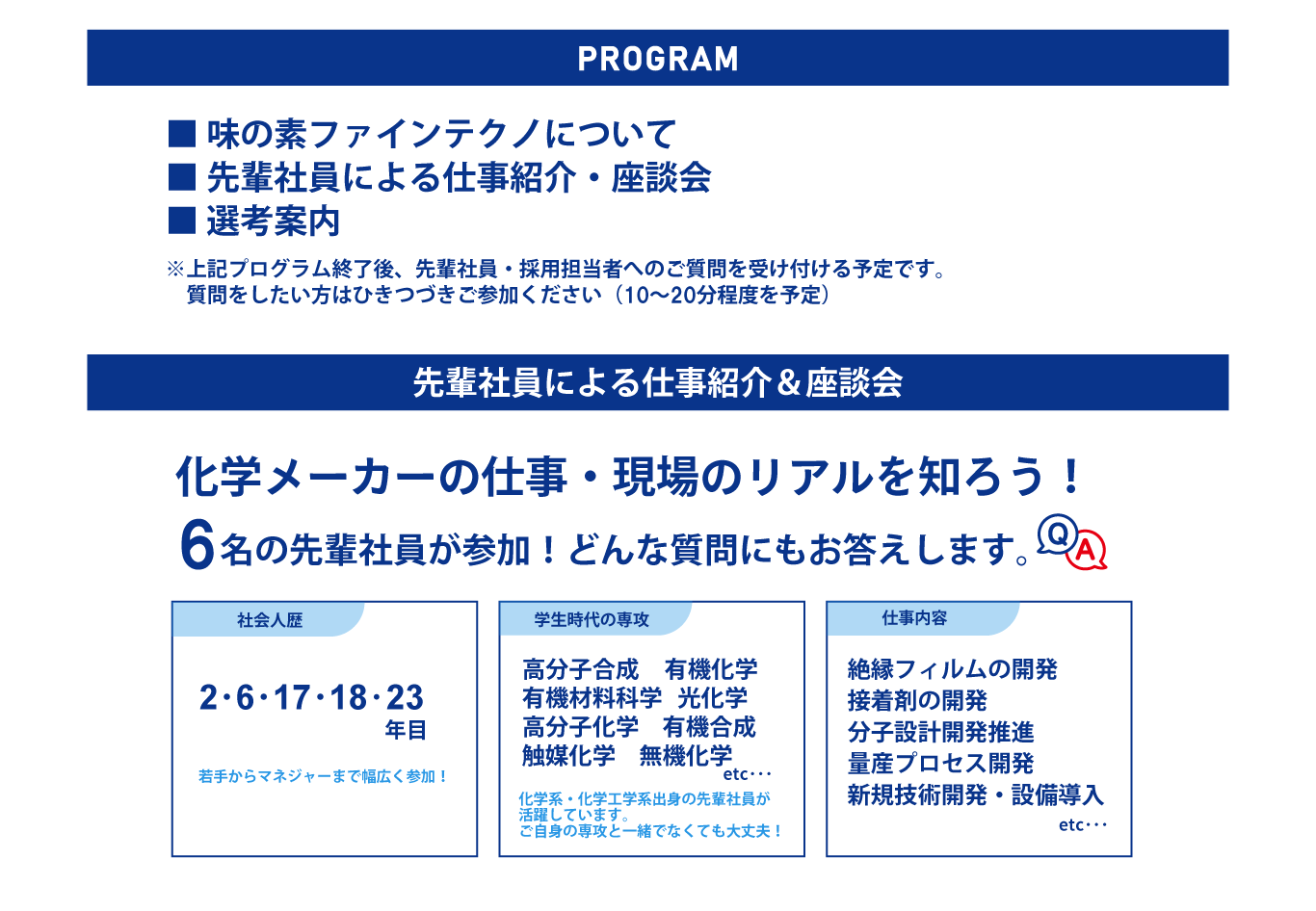 ●味の素ファインテクノについて ●先輩社員による仕事紹介・座談会 ●選考案内 ※プログラム終了後、先輩社員・採用担当者へのご質問を受け付ける予定です。 質問をしたい方はひきつづきご参加ください(10~20分程度を予定) |