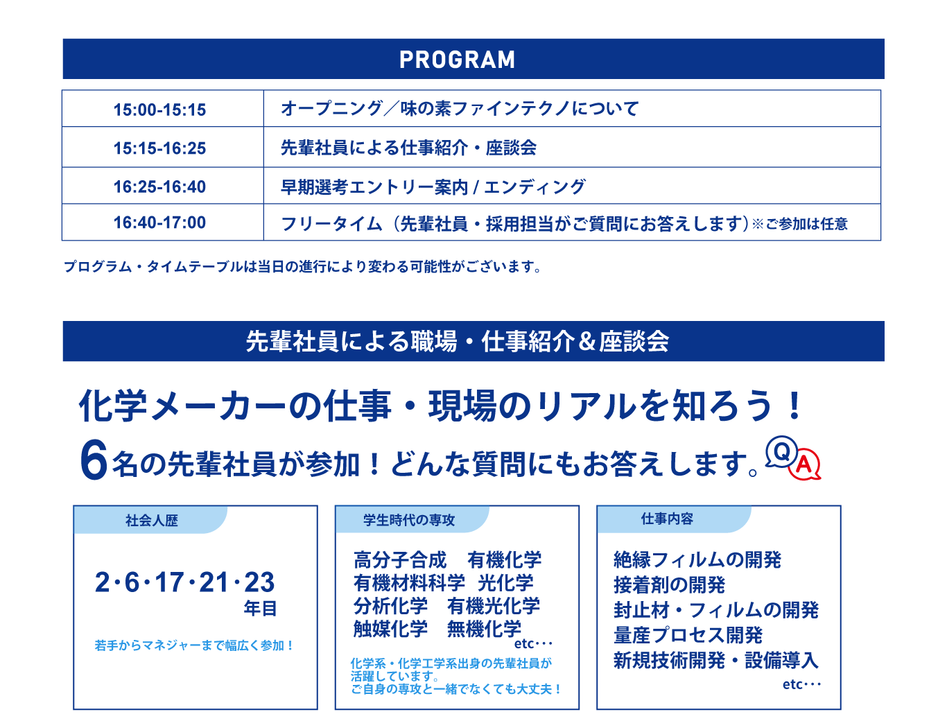 化学系学生のための就活 マイページより参加予約をお願いします。 予約完了後、参加用ZoomURLおよび会社説明動画をご案内いたします。 会社説明動画はイベント当日までにご視聴ください。 ※終了後アンケートへのご協力をお願いいたします。 |